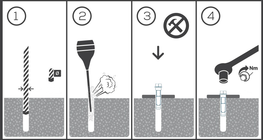 | Product Code | Drill Hole Diameter (mm) | Anchor Length (mm) | Max. Fixture Thickness (mm) | Min. Hole Depth (mm) | Box Packing | |